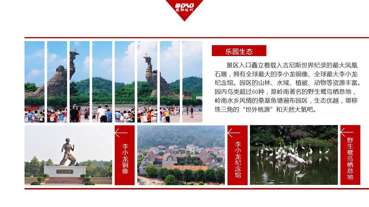 佛山順德李小龍樂園景區占地面積超3000畝,坐擁22座青山,湖泊密布,集嶺南生態莊園、古建筑藝術、李小龍紀念館、功夫文化、特色民俗、順德美食、休閑娛樂、科普教育、大型文體活動為一體的全站式主題樂園。